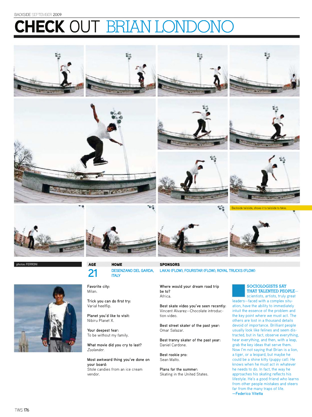 Ulteriore ciliegina sulla torta, il buon Brian ha ottenuto un checkout sul prossimo Transworld Skateboarding di settembre con una foto in bs tail shoveit to tail slide fakie out, scattata da Hubbe a Barcellona e arricchita dal testo di Federico Vitetta, Team manager e filmer Lakai